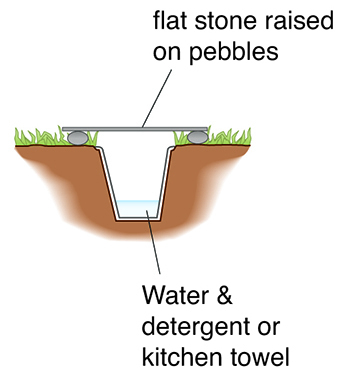 This trap is made by simply burying a large yoghurt pot or jam jar in the ground so that the rim of the container is flush with the soil surface. Insects running along the ground fall into the container and cannot climb out. The opening of the trap is covered with a flat stone raised off the surface with pebbles, allowing insects to enter the trap but preventing small mammals from falling into it. To trap live insects, the bottom of the container is filled with dry vegetation or a folded kitchen towel, paper tissues or similar, giving the insects somewhere to settle. Pitfall traps are good for collecting ground beetles (family Carabidae) and wolf spiders (family Lycosidae).