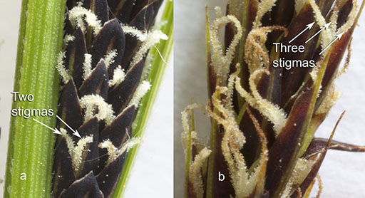 Figures 1 and 2 provide another example of two different species that are almost identical apart from some tiny differences. The images shown are of two very similar species of sedge that often grow in similar conditions and can be separated by the number of their stigmas (the white female part of the flower that collects pollen grains). Figure 1 (a) is a close-up of the slender tufted sedge (Carex acuta), which has pairs of stigmas. While Figure 2 (b) is the lesser pond sedge (C. acutiformis), which has stigmas grouped in threes. The difference is clearly visible with a hand lens.