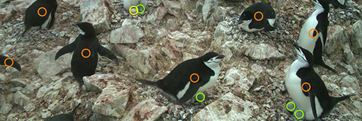 Penguin colonies are found around the Southern Ocean and, as penguins are predators, the health of these colonies is an important indicator of the state of the marine ecosystem. Their geographical range is huge and the habitats they occupy are challenging for observers. PenguinWatch [Tip: hold Ctrl and click a link to open it in a new tab. (Hide tip)] is a citizen science project that has set up a network of cameras on South Atlantic islands and the Antarctic peninsula to monitor penguin colonies all year round. The health of the colonies can be assessed by looking at survival rates of chicks and overall numbers in each colony. Extracting data from the cameras is a time-consuming process, which will eventually be automatic, but at present it is done by over 47,000 volunteers who access the camera images online, marking the adults, chicks and eggs they observe in each image with different-coloured circles. In the image shown in Figure 2, the adults are marked with an orange circle, the chicks with green and the eggs with yellow. There are only six species that might be encountered in the images, but other animals are sometimes visible, so species identification skills are required.