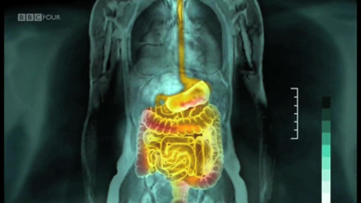Movements of the gut push the camera, in the same way that they would push food through the digestive system. In the next video you can see the route that a camera, and therefore food, would take.