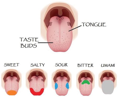 The third sense in combination with smell and sight is taste. The tongue’s receptors can recognise different tastes in different parts (Figure 2).