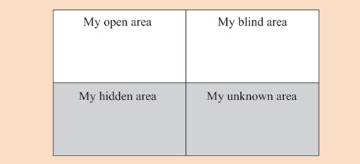 - Get a large sheet of paper and draw yourself a Johari Window diagram. You can create one on your computer if you are more comfortable with that. It should look something like Figure 6, with four headings as shown, and have space to write a few things in each box. (You do not have to make it particularly neat as you are going to change it soon by finding out new information about yourself.)