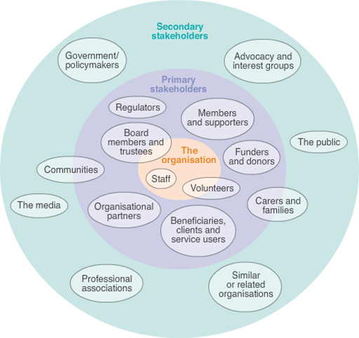 The inner circle of the diagram – directly circling ‘The organisation’ – depicts the primary stakeholders. These are individuals and groups that have a direct, specific interest in how the organisation is run, its mission, its effectiveness and other day-to-day issues.