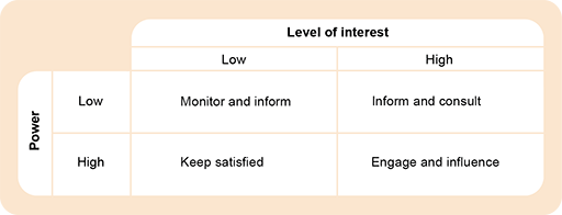 You can use the matrix in Figure 4 to think about possible strategies on how to work with stakeholders: this is depicted in Figure 6.