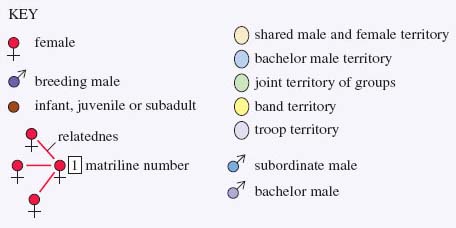 several males and several females (multimale-multifemale); Figure 7e shows such a group, where the females are related (termed matrilineal).