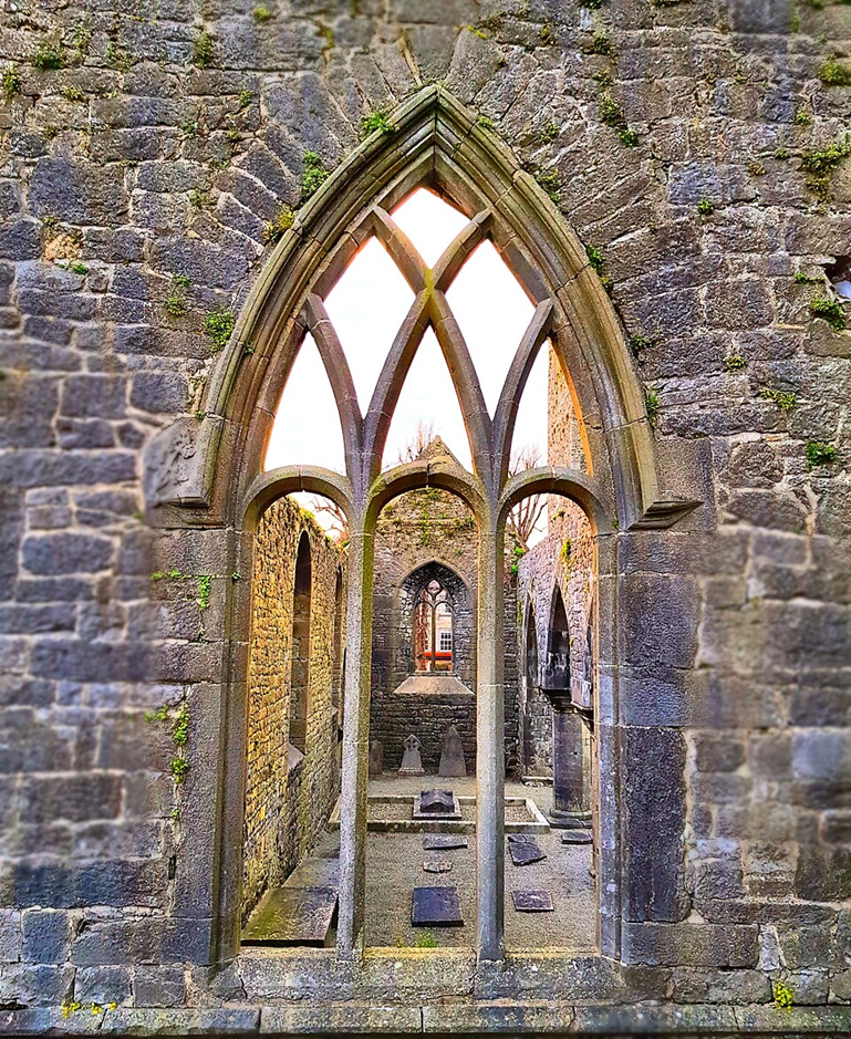 Photograph of a gothic window in a ruined abbey wall. Source: Wikimedia Commons