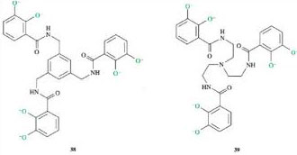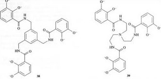 As with enterobactin, both 38 and 39 will coordinate to iron(III) via the six deprotonated oxygens in each structure (highlighted in green below).