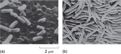 Figure 16 Scanning electron micrographs of E. coli grown in medium containing a few parts per million of cis-diamminedichloroplatinum(II). (The same magnification is used in each image.) The platinum drug has inhibited cell division (a), but not growth (b), leading to long filaments.