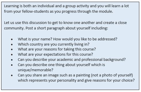 | Course: | Developing a Sense of Belonging in online distance learning |