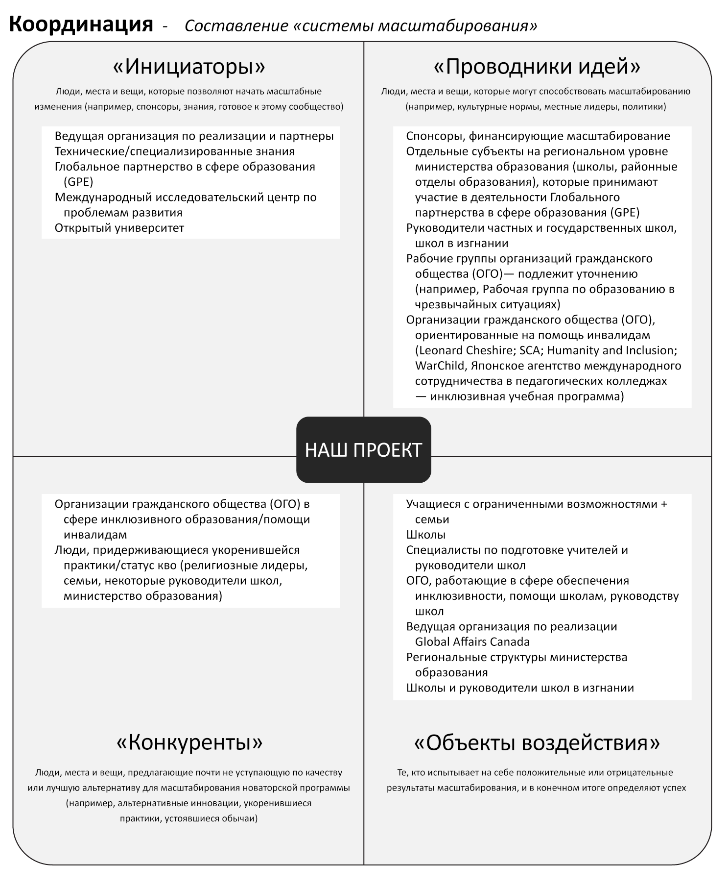 В Курсе 3 вы ознакомились с материалами пособия по масштабированию IDRC Scaling Playbook. На странице 13 пособия имеется бланк задания «Составление системы масштабирования», который мы приводим здесь. Он предназначен для определения круга заинтересованных сторон при масштабировании программы ПРУ: