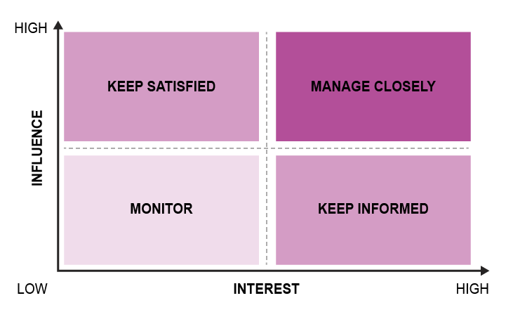 The position of each person or organisation on the chart indicates how they should be engaged. Those with high interest and high influence should be the main focus of attention – they could even become strategic partners. Those who are less interested and less affected or influential may receive less attention.