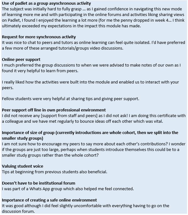 Students feel much more part of a group since the change from non-cohort to cohorted. This has also had a huge impact on success, progression, completion and retention rates. Student feedback (see below) is largely positive in terms of the benefits of collaborative activities, although comments highlight how different students have different needs, with some receiving adequate peer support in their professional context, and so requiring less from peers on the programme.