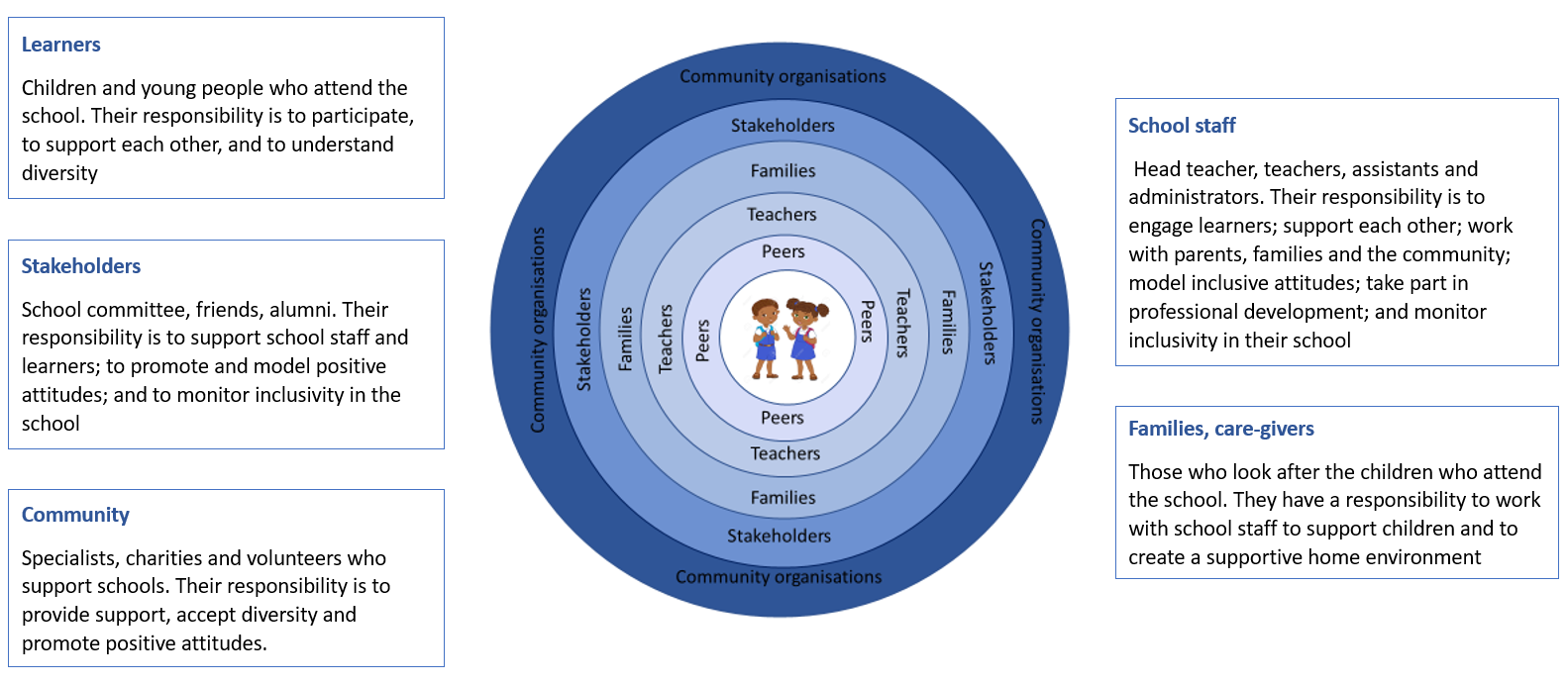 Reflection point Look carefully at Figure 1. The people in each layer have a role to play in creating an inclusive school, but they also have responsibilities. Reflect on the responsibilities of learners. What can adults do to help learners take on these responsibilities? |