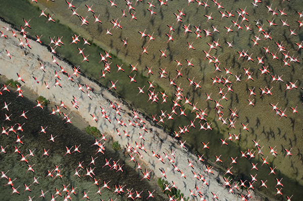Flamingos over saltmarshes in Bahía de Cádiz Natural Park, Cádiz, Andalusia, Spain. Credit: Diego López / Wild Wonders of Europe.