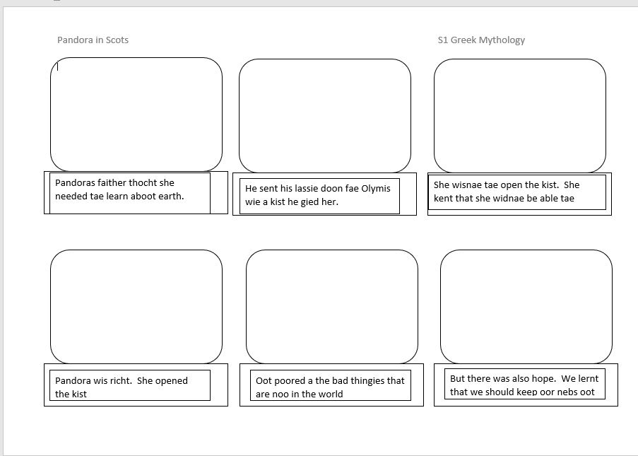 We have started teaching a common curriculum with our BGE classes, so I had to do a bit of thinking as to how I was going to teach a Scots lesson in the midst of a Greek Mythology unit! However, I found through the Scots Language Centre, a link to BBC retellings of Pandora's Box and a few other in Scots - recordings. I really didn't want to do a stand alone lesson - I want to see Scots embedded in the curriculum instead of being something that just appears for no apparent reason. The class are S1 mixed ability.