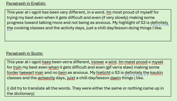 writing a paragraph reflecting on how their year at i-Sgoil in S3 has