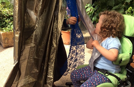 Children with complex medical needs may find that sensory activities are especially enjoyable. The movement of sunshine and wind on some special fabric outside can lead to all kinds of songs and peek-a-boo games. These are games and play that can draw all children into a shared game and of course, some children have strong sensory preferences and dislikes.