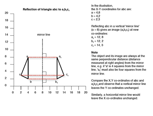 Reflecting abc in a vertical ‘mirror line’ (x=8) gives an image (a1b1c1) at new coordinates: