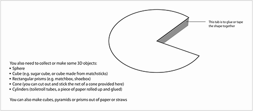 You may use a selection of cubes (dice, blocks), rectangular prisms (boxes, wooden blocks), triangular prisms (wooden wedges, fancy chocolate boxes), spheres (balls), pyramids (wooden or plastic), cylinders (toilet rolls, pens, dowel sticks), cones (party hats, ice cream cones). You may also like to include one or two irregular or semi-irregular objects (stones, shells, leaves) to provoke discussion. All of these could be collected locally to help to link mathematics to the local environment.