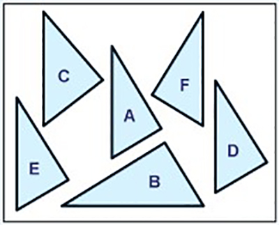 • Next, on a separate piece of paper, ask your pupils to draw around each shape; then move the shapes any way they like without overlapping what they have already drawn, and draw round them again. Repeat this until the page is full of shapes, then label inside each outline with a letter (e.g. a, b, c…). (The finished work should be similar to Resource 2: Examples of congruent shapes.)