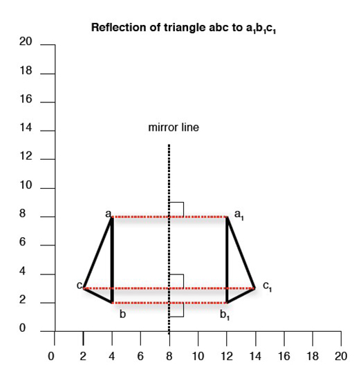 Reflecting abc in a vertical ‘mirror line’ (x=8) gives an image (a1b1c1) at new coordinates: