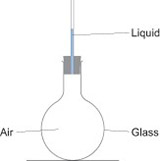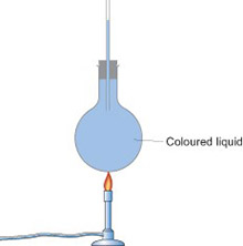 Fill a boiling tube with coloured water, then insert a narrow glass tube (inserted through a cork or bung) into the neck of the boiling tube: make sure the end of the glass tube is in the water. As you heat the water in the boiling tube, you should see the column of coloured liquid in the glass tubing get higher and higher, because the liquid is expanding as it is heated. This is how liquid-in-glass thermometers work.