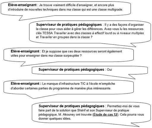Dans les différentes sections de la Boîte à Outils, vous allez rencontrer des superviseurs qui ont des rôles différents : par exemple, certains sont Formateurs d’encadreurs pédagogiques ou P ENI, d’autres Conseillers pédagogiques ou Inspecteurs. Les enseignants qu’ils forment (que nous avons appelés enseignants en formation) sont élèves-P ENI, élèves-instituteurs ou enseignants en poste. Lisez les contributions de ces superviseurs avec attention : la manière dont ils opèrent et les stratégies qu’ils emploient sont transférables à votre propre rôle. Au cours de vos lectures, annotez l’étude de cas qui les concerne pour enregistrer la manière dont vous vous servirez de leurs expériences pour votre propre rôle.