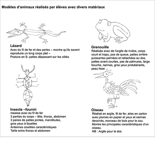 Dans plusieurs régions du Togo, des hommes gagnent leur vie en vendant des modèles d’animaux très réalistes. Nous pensons qu’il est légitime, pour l’étude de différents animaux, d’exploiter avec les enfants ce désir naturel de vouloir reproduire la vie en la copiant. En demandant aux enfants de fabriquer des modèles, vous intégrerez ainsi la technologie et l’art à la science.