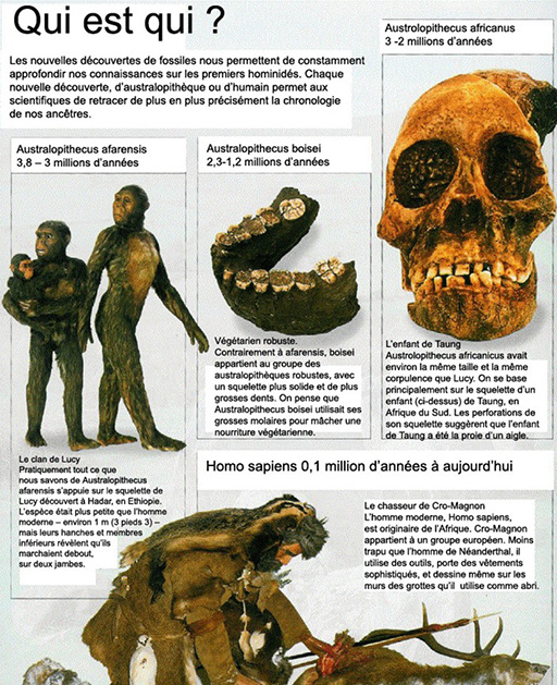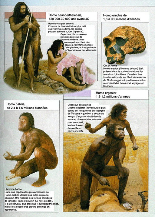 La plupart des experts s’accordent sur le fait que l‘espèce à laquelle nous appartenons, Homo sapiens, a évolué en Afrique, il y a entre 200 000 et 100 000 ans. Il y a environ 30 000 ans, Homo sapiens se trouvait dans toutes les parties du monde, excepté les Amériques. Il y a 11 000 ans, il peuplait tous les continents excepté l’Antarctique.