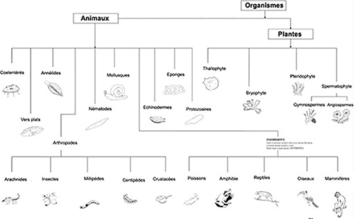 Ensuite, elle a distribué une petite carte à chacun des élèves et leur a demandé de dessiner une plante ou un animal d’un côté et d’écrire le nom de la plante ou de l’animal au dos de la carte. Chaque dessin devait représenter quelque chose de différent des autres. Les cartes ont été rapportées au bureau et triées, affichées et discutées. Mme Akakpo s’est assurée du tri correct des cartes. (Elle avait à l’esprit le schéma organisationnel de la Ressource 2 mais elle a choisi de ne pas embrouiller les élèves en leur donnant trop d’explications prématurément.)