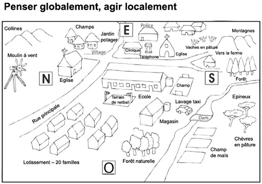 Vous pouvez débarrasser votre bureau, placer une boîte d’allumettes au centre pour représenter l’école puis écrire les noms des diverses ressources sur de petites cartes. Les cartes peuvent être placées dans une position qui représente la direction et la distance de chaque lieu ou infrastructure rencontrés. Vous pouvez également utiliser un code couleur, une couleur pour les choses de la nature et une autre pour les constructions.