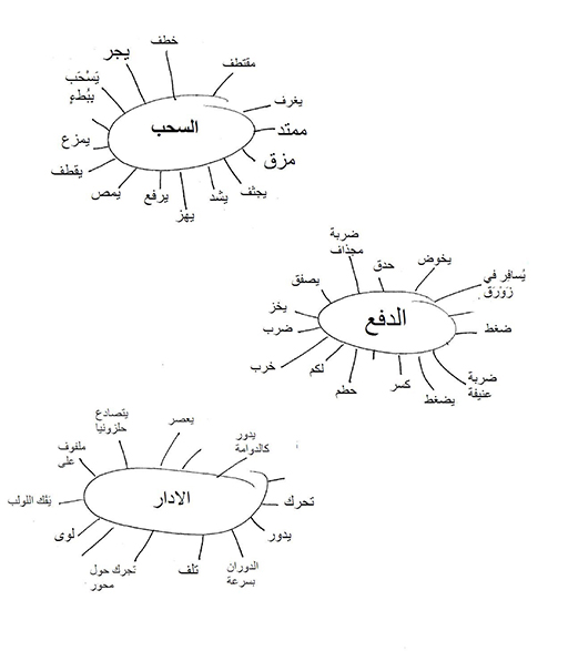 اكتب الكلمات "يسحب"، "يدفع" و "يلوي ويدور" على السبورة بعيدة عن بعضها البعض (أو على أوراق صحف منفصلة) فكر في كل مفردات فعل القوة التي يفكر فيها التلاميذ وشكل شبكة لكل المصطلحات (انظر المصدر ٣). شجع التلاميذ على استخدام كل اللغات التي يفهمونها ويستعملونها. هل هنالك أي كلمات مثل ينخسأو الجلد وحتى يمدد أو يلطخ.