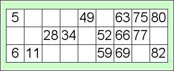 Huu ni mchezo wa kamali ambapo namba hutengwa bila utaratibu maalum na kuwekwa katika kadi ya bingo ambayo hujumuisha nafasi tupu za mraba. Mfano mmojawapo ni kama ioneshwavyo hapa chini: