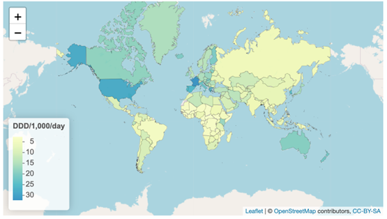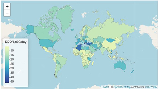 The map in Figure 7 is taken from the website of the Global Research on Antimicrobial Resistance (GRAM) Project, based at the University of Oxford. An interactive map shows antibiotic usage worldwide from 2000 to 2018. Use the sliders to explore patterns in the data, and answer the following questions: