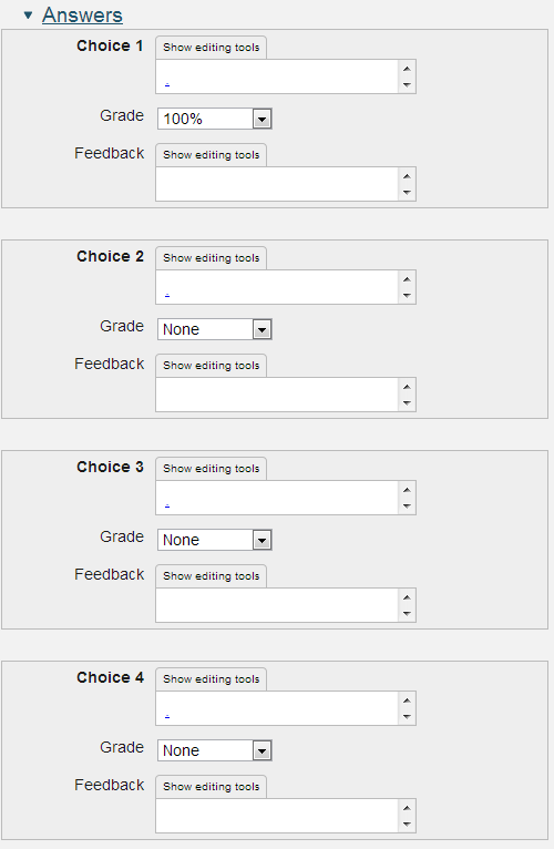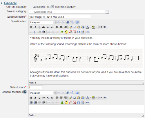 Default mark: Decide on how to score your questions and be consistent. N.b. If you are asking a question that you do not wish to count towards the total score you should set the Default mark to zero. However you will still need to mark one response as correct with a Grade of 100%.