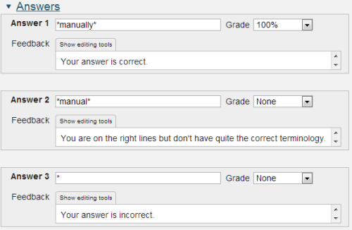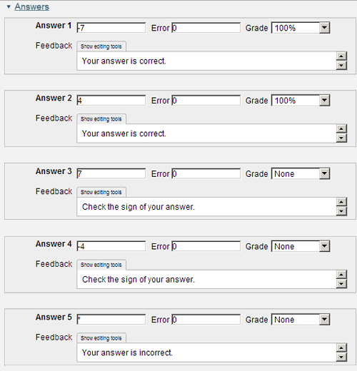 The value for Grade is set between None and 100% but again we have chosen not to give feedback here.
