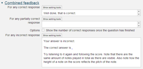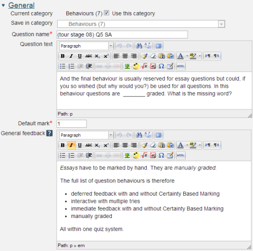 General feedback: We recommend that all questions should have this box completed with the correct answer and a fully worked explanation. The contents of this box will be shown to all students irrespective of whether their response was correct or incorrect. We do not recommend that authors rely on using the machine generated 'Right answer' (from the iCMA definition form) as this is: