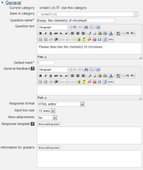 Essays are created in the same way as other questions but essays are not automatically marked and consequently there is no response matching section.