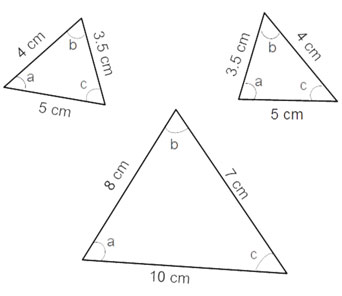 That means that the proportion or ratio of all the corresponding sides will be the same (for example, the second triangle has sides twice the size of the first). And that is why these criteria about similarity of triangles make sense.