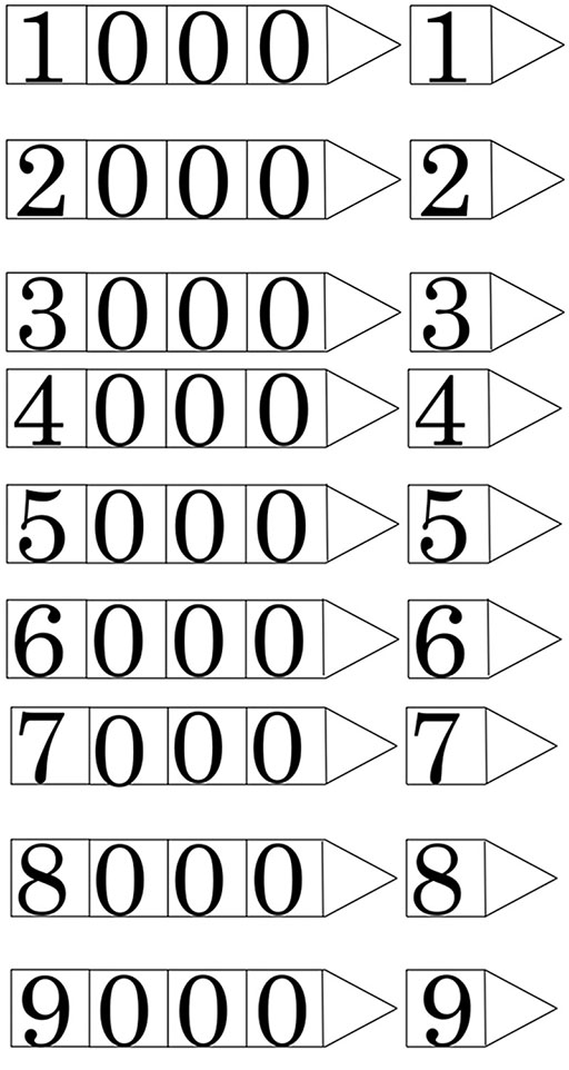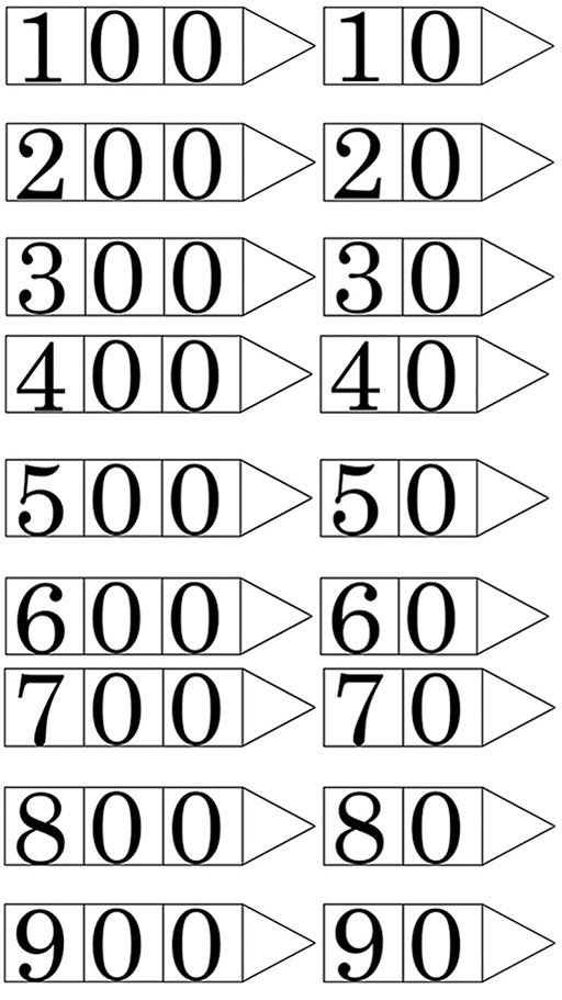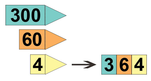 उदाहरण के लिए, चित्र 1 यह दिखाता है कि 300 + 60 + 4 से संख्या 364 कैसे बनती है।