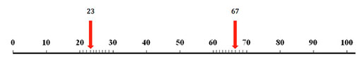 विद्यार्थियों की समझ को विकसित करने में मदद करने के लिए एक संख्या रेखा बहुत ही मज़बूत विज़ुअल छवि प्रदान करती है, जहाँ दी गई कोई भी संख्या स्थानीय मान की अन्य संख्याओं के संबंध में अवस्थित होती है। उदाहरण के लिए, चित्र 3 संख्या रेखा पर संख्या 23 की स्थिति और साथ ही अन्य संख्या के संबंध में उसका माप दर्शाता है, उदाहरण के लिए 67। संख्या रेखा यह भी दिखाती है कि संख्या 23, 20 और 3 (या बहुत सारे दस और तीन) को जोड़ कर बनाई गई है।