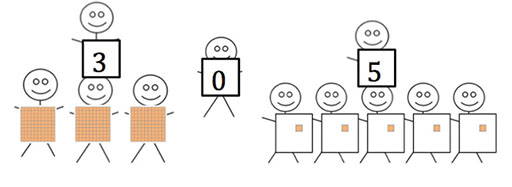 उनमें से राम नाम के विद्यार्थी ने इशारा किया कि ‘आपने 35 लिखा है लेकिन यह 305 होना चाहिए – आपको उसमें शून्य लगाना चाहिए’। मैंने बड़े कार्ड पर 0 से 9 तक सभी अंक लिख दिए और राम से आगे आकर दो अन्य समूहों के बीच खड़े होकर शून्य कार्ड को पकड़ने के लिए कहा (चित्र 7)