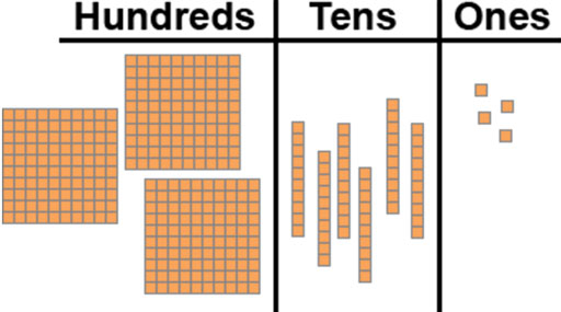 मैंने ब्लैकबोर्ड पर 243 लिखकर और यह पूछकर शुरुआत की कि ‘इस संख्या में कितने सैकड़े हैं?’ सही जवाब दिए जाने के बाद, मैंने दो विद्यार्थियों को कक्षा के सामने आकर बड़े कार्डबोर्ड के दो ‘सैकड़ा’ ब्लॉक को ऊपर उठाने के लिए कहा। मैंने ऐसा ही दहाई और इकाई के लिए भी तब तक किया, जब तक संख्या 243 को सही ढंग से दर्शाया नहीं गया। समेकित करने के लिए, निम्न तरीके से ब्लैकबोर्ड पर तीन स्तंभों में संख्या को दर्शाया: