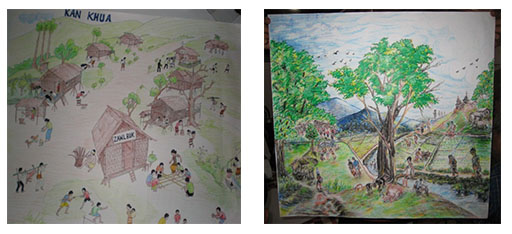 चित्र 1: बायाँ, ‘My Village’ और दायाँ, ‘Agriculture’, © स्थानीय कलाकार – अज्ञात (Figure 1: left, ‘My Village’ and right, ‘Agriculture, © local artists – unidentified)।