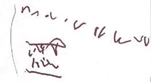 चित्र 1 को देखें, जो एक चार–वर्षीय बालिका के ’लेखन’ को दर्शाता है। उसने आत्मविश्वास के साथ अपनी प्री–स्कूल शिक्षक को बताया कि वह संख्याएँ और वर्ण लिख रही है। आप एक लेखन–अंश के रूप में इसका मूल्यांकन किस प्रकार करेंगे, या क्या आपको लगता है कि यह केवल निरर्थक कलम चलाना है? इस लेखन अंश के बारे में अपने विद्यालय के अन्य शिक्षकों से बात करें। इस पर उनकी क्या प्रतिक्रिया है?