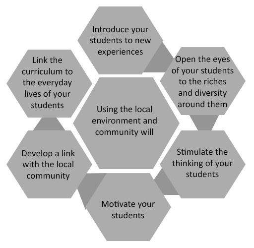 आप अपने आसपास के पर्यावरण में ऐसे लोगों को खोज पाएंगे जो अनेक विषयों के संबंध में अनुभव रखते हैं; आप अनेक प्राकृतिक संसाधनों को भी खोज सकते हैं। इससे आपको स्थानीय समुदाय के साथ संबंध बनाने में, इसके महत्व को दिखाने में, विद्यार्थियों को उनके पर्यावरण की समृद्धि और विविधता को देखने के लिए उत्प्रेरित करने में, और सबसे महत्वपूर्ण रूप से, आपको विद्यार्थियों के शिक्षण के लिए एक समावेशी कार्य पद्धति अर्थात स्कूल में और स्कूल के बाहर सीखने, की दिशा में काम करने में सहायता मिल सकती है।
