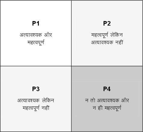 अपनी डायरी में बॉक्सों को ‘P1’, ‘P2’, ‘P3’ और ‘P4’ लेबल करते हुए अत्यावश्यकता ग्रिड का अपना खुद का संस्करण बनाएं। अब उन कार्यों पर विचार करें जो पिछले दो सप्ताहों में आपके पास आए हैं और उन्हें प्राथमिकता की विभिन्न श्रेणियों में लिखें। वे ऐसे कार्य नहीं होने चाहिए जो अब पूरे हो गए हैं। वे महत्व और अत्यावश्यकता में भिन्न होंगे।