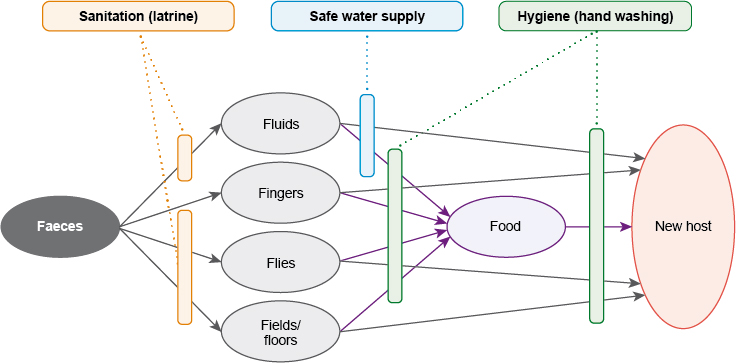 Figure 1.3  Pathways of disease transmission, known as the ‘F diagram’. Note how water, sanitation and hygiene are each identified as barriers to transmission at different steps in the transmission route.
