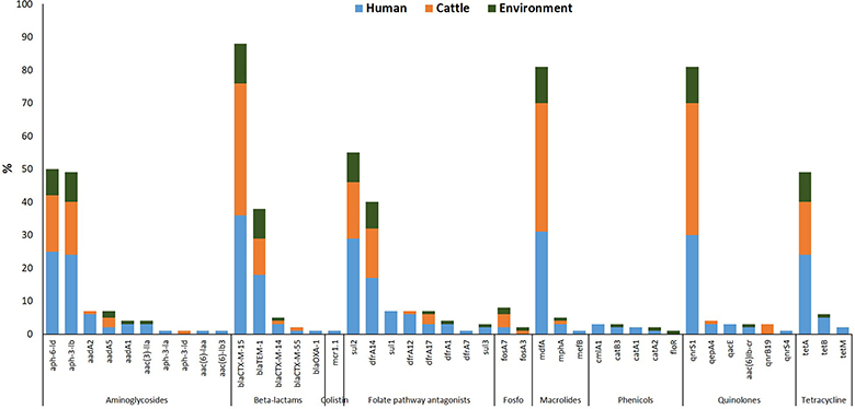 Figure 3 Percentage of different AMR genes detected in ESBL-producing Escherichia coli isolates from three sources: humans (blue), cattle (orange), and abattoir environments (dark green) in Nigeria (Aworh et al., 2022). Each bar represents the total number of isolates carrying a specific resistance gene (named under each bar), grouped by antimicrobial class. The data was generated using WGS, enabling detailed comparison of gene distribution across the human-animal-environment interface (Nilsson, 2025).
