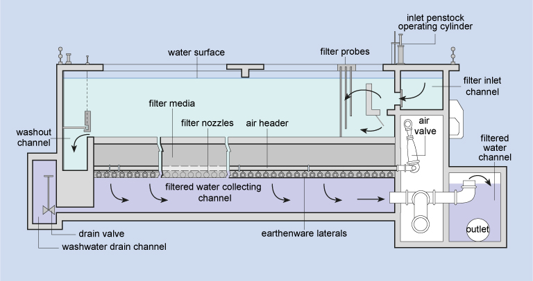Figure 5.7  Cross-sectional diagram of a rapid gravity sand filter.